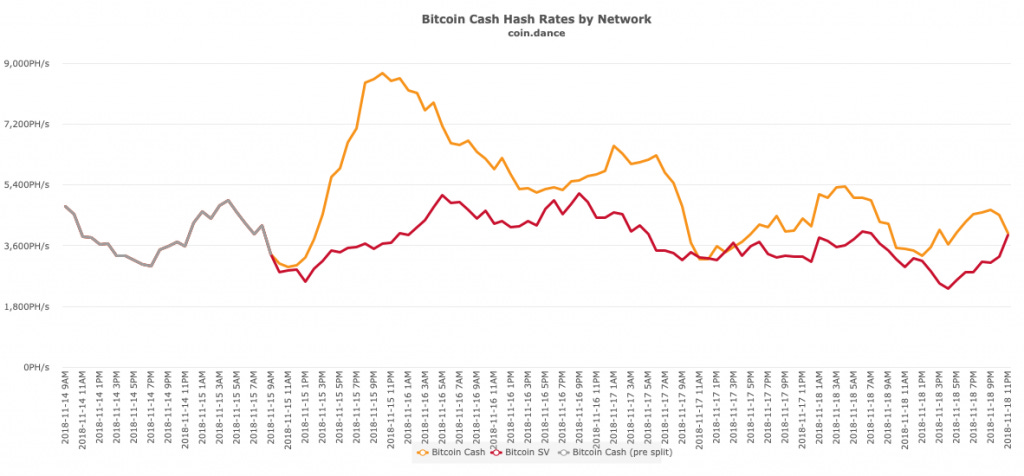 從礦工的運算能力來看,雙方的算力在我寫作的當下是勢均力敵。從幣價來看,代表 ABC 改革陣營的 BCH 幣目前價格是一枚 370 美金左右,而代表 SV 保守陣營的 BCHSV 幣則是一枚 90 美金左右。