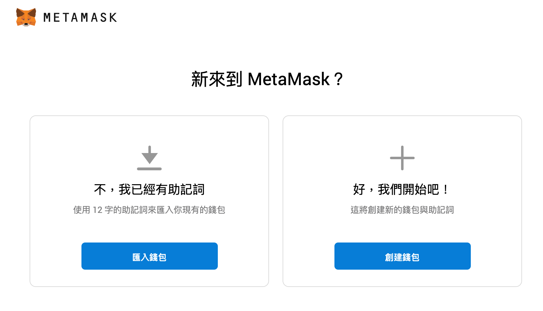 如果你目前使用的是 Chrome、Firefox、Opera 或 Brave 瀏覽器,我推薦你在瀏覽器上安裝 MetaMask 這個錢包外掛服務。它是目前全球最主流的錢包外掛服務。安裝完 MetaMask 之後,點擊瀏覽器工具列上的那隻狐狸,你就會看到下方這個視窗。