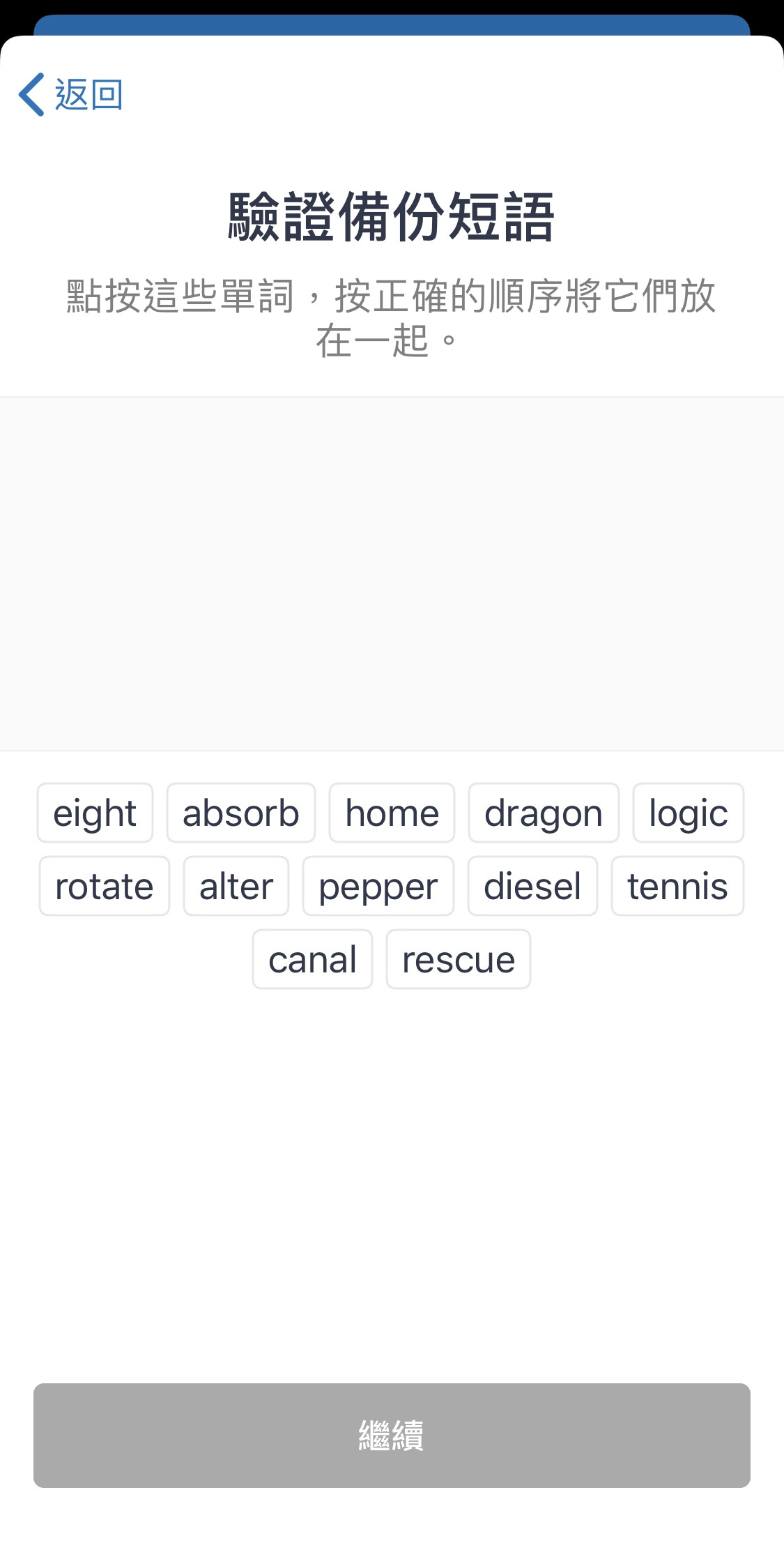 再回到操作流程。假如你已經把這 12 個英文單字的排列順序記起來了,畫面會請你重新輸入一次排列順序,確保你是真的有記住。