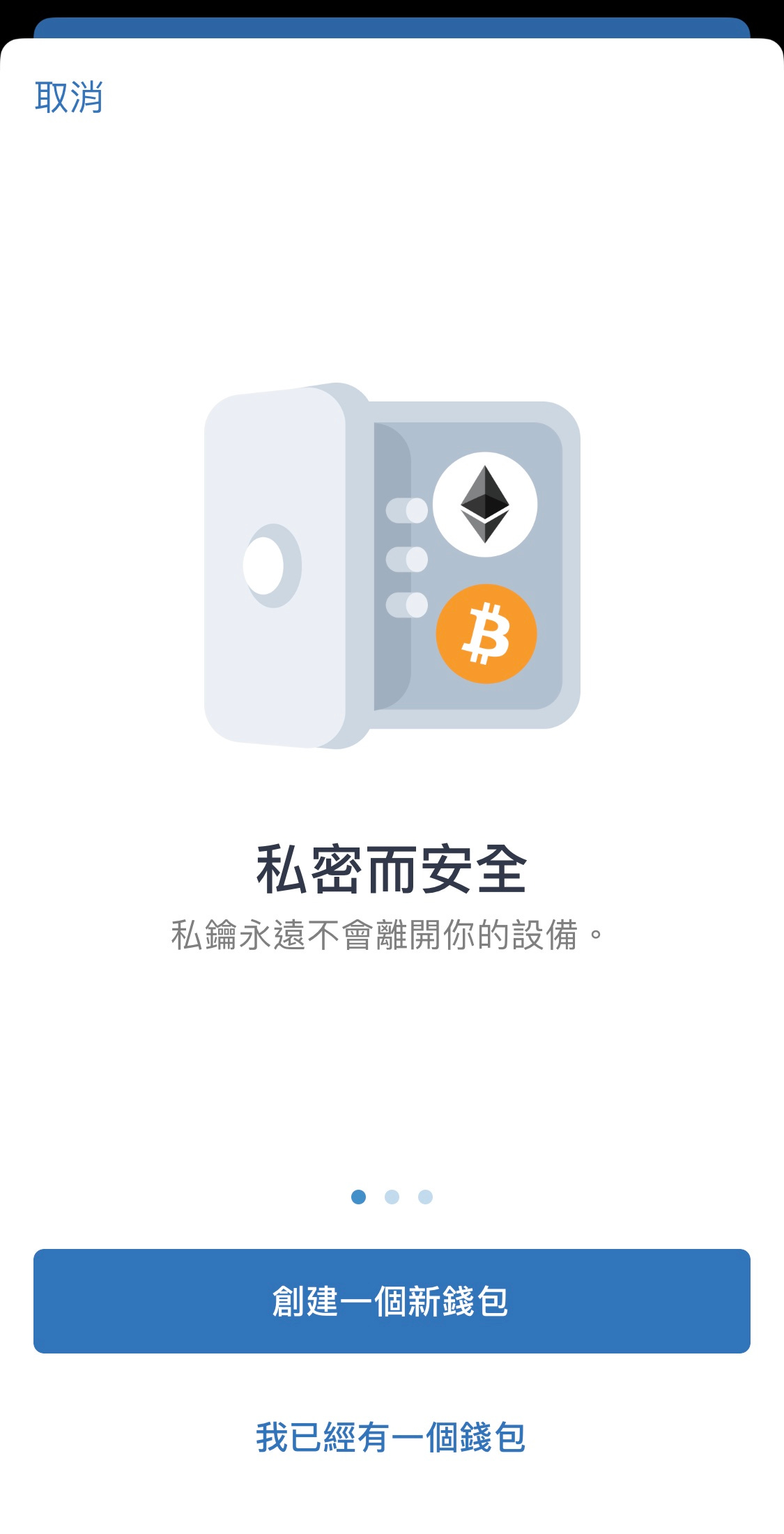 釐清問題之後,我們再回到手機畫面。假設大家過去都沒持有過虛擬貨幣,請選擇「創建錢包」。