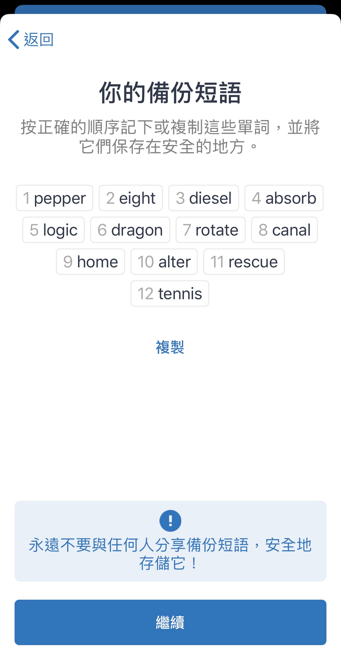 接著,馬上就會出現備份短語的畫面,你需要找一張紙抄下來。如果你是用手機截圖,那是風險比較高的做法(雖然我自己也是這麼做)。為什麼會說風險高呢?