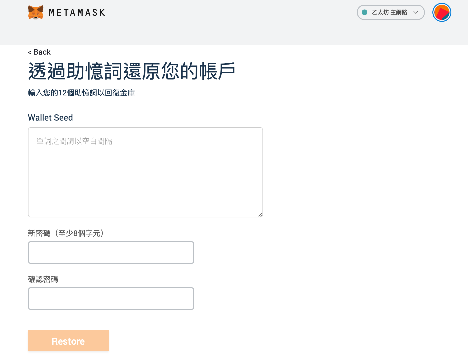 目前 Trust Wallet 沒有推出網頁版的錢包服務,所以我們才改用 MetaMask。CREATE 按鈕就好像是電子郵件的「註冊」,而 Import with seed phrase 按鈕就好像電子郵件的「登入」。既然我們剛剛已經創建過收款地址及備份短語,所以現在只要「登入」就行了。
