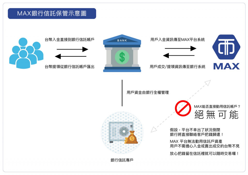 舉例來說,在 MaiCoin 集團底下的 MAX 交易所就與凱基銀行合作。將用戶原本要存入 MAX 交易所的「新台幣」,存放在凱基銀行的信託專戶內。即便 MAX 交易所意外倒閉,用戶只會損失比特幣等虛擬貨幣,帳戶內的新台幣仍然安全無虞。