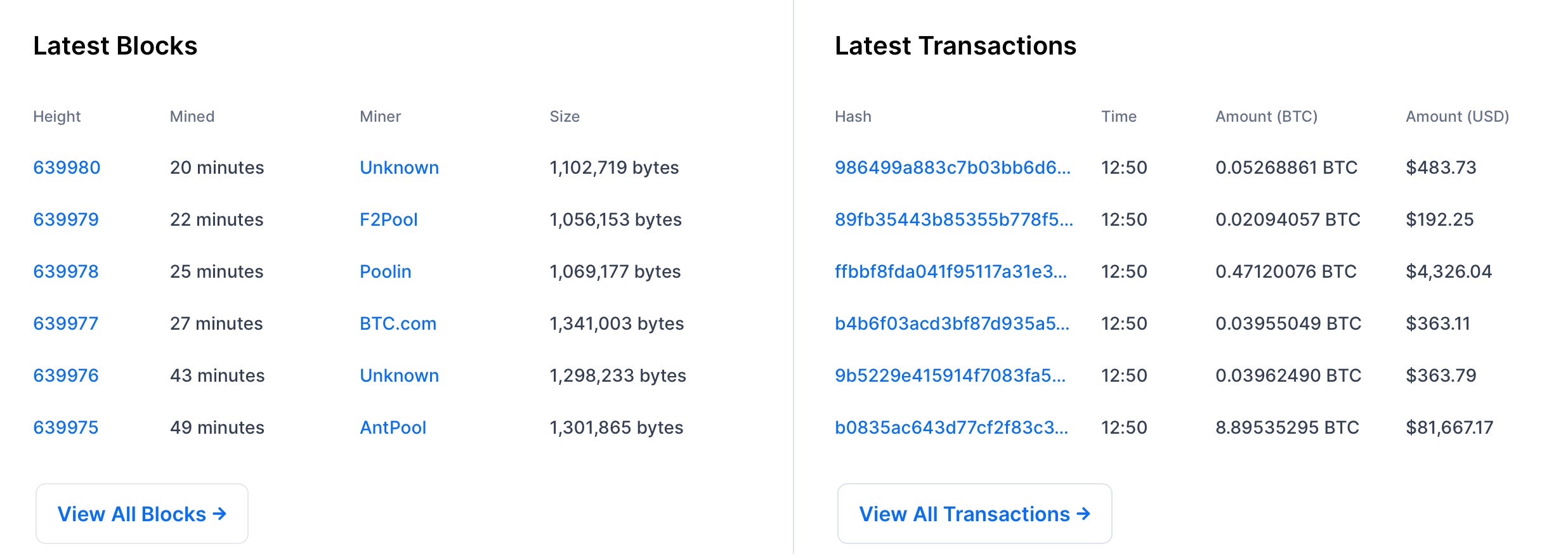 如果你好奇比特幣帳本是長什麼樣子,點這裡你就能看到即時的帳本更新。你可以把區塊(Blocks)當成帳本上的每一頁,所以他會有頁碼(Height)、這頁什麼時候被記錄(Mined)、這頁的記帳者(Miner)和這頁的資料有多大(Size)。
