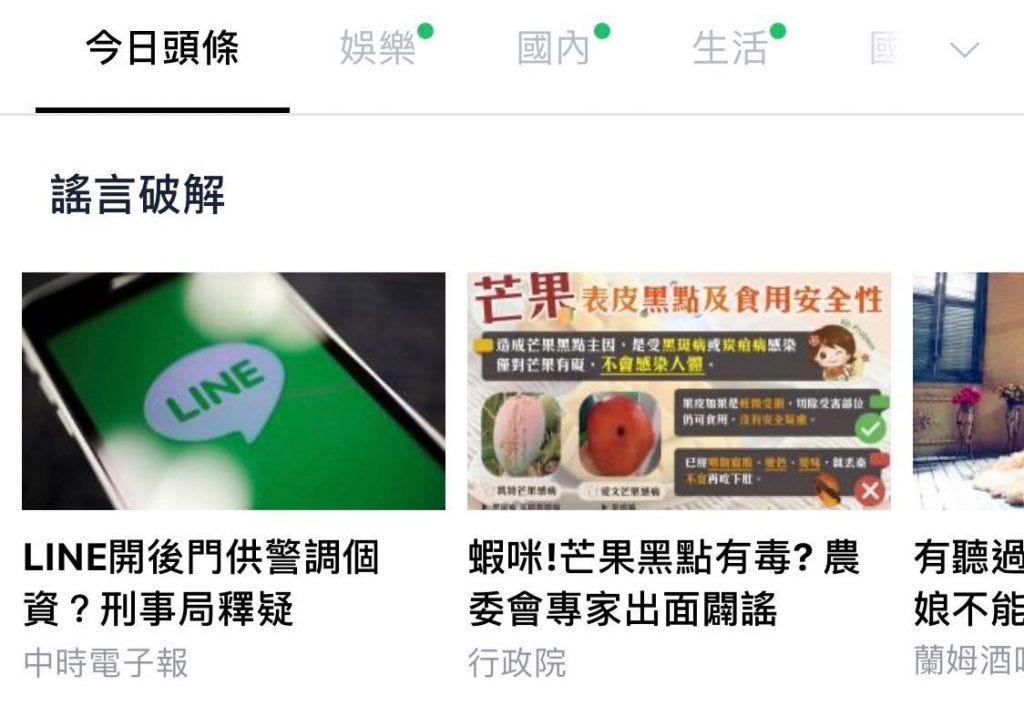 LINE 宣布推出「謠言查證」官方帳號與官方網站,並且在 LINE TODAY 透過「謠言破解」專區主動說明目前流傳內容是否為假新聞,藉此降低假新聞被擴散機率。