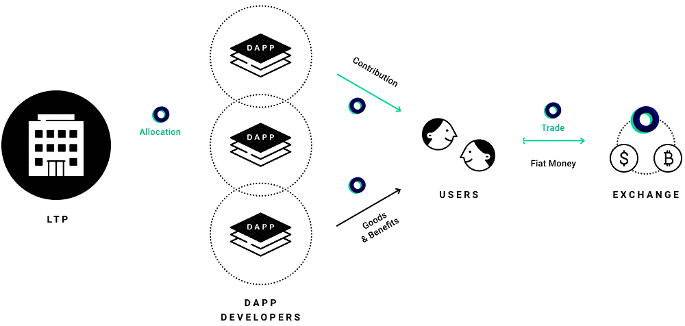 最左邊是由 LINE 成立的公司 LTP,負責將 LINK 配發給特定的應用開發商,用戶再以「貢獻挖礦」的方式從應用開發商手上賺得 LINK 代幣。但並不是所有的應用開發商都可以拿到代幣配發,只有 LINE 自家開發的應用或經過 LINE 篩選的少數應用開發商,才能擔任代幣供給者的角色(稱為 LINE Alliance dApp)。剛剛舉例的 Wizball 和 LINE Pasha 都是 LINE 自家開發的應用。