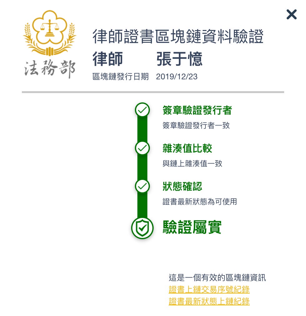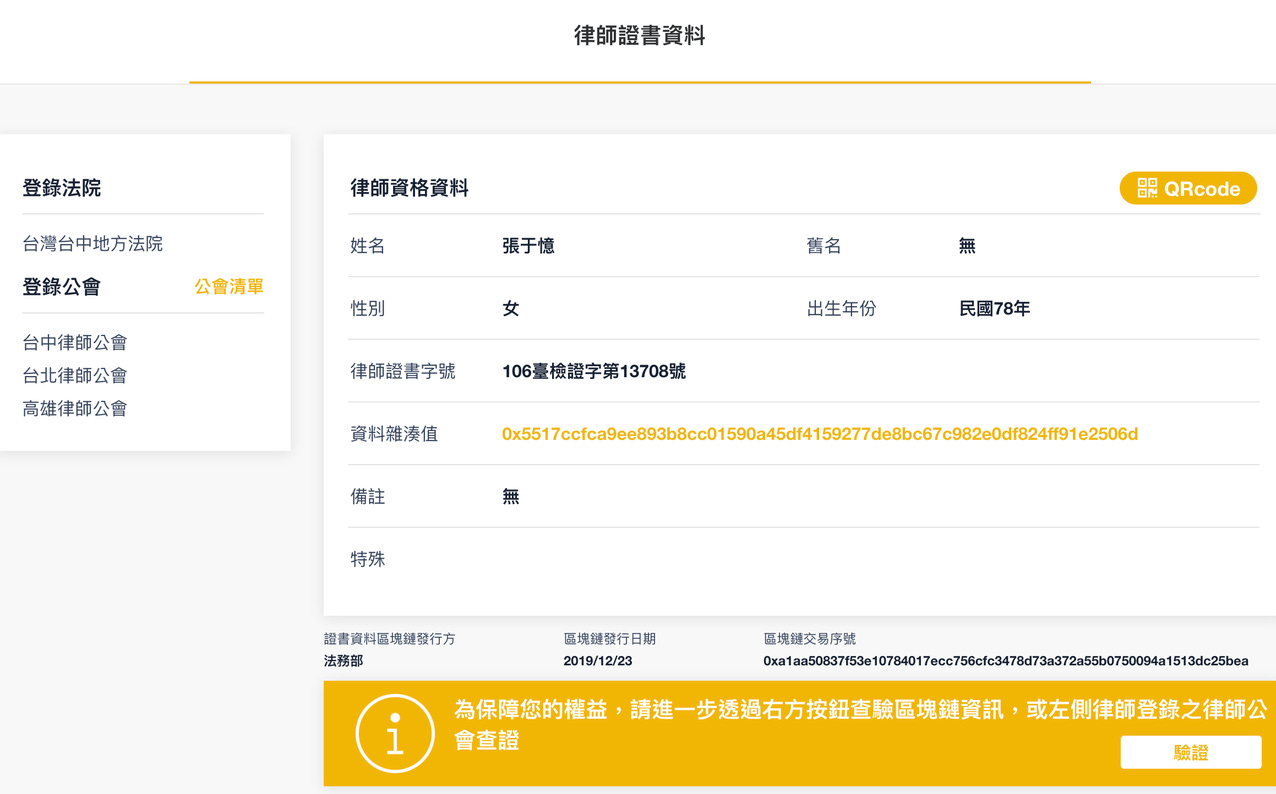 若點擊律師查詢頁面下方的驗證按鈕或是掃描頁面右上方的 QRcode,則會出現下圖: