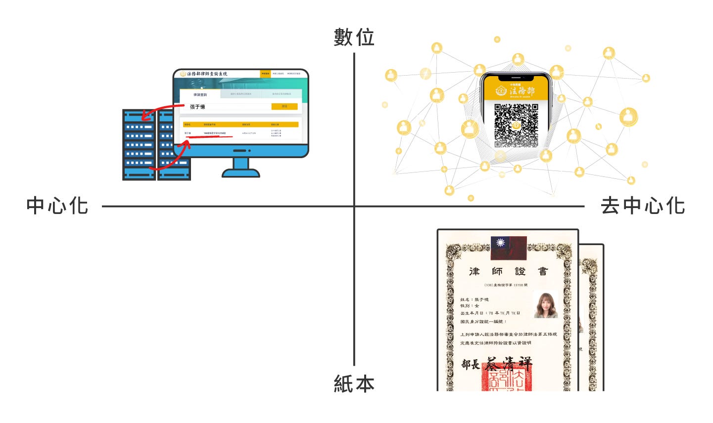 我在 2019 年提出〈上帝視角〉這套分析框架,就是用來釐清使用區塊鏈前後有何差異。它非常好用。若你還沒看過那篇文章,推薦你先讀完再回來往下看。我直接將原本就行之有年的紙本律師證書(右下角),以及數位律師證書查詢系統(左上角)分別填入上帝視角的象限圖內。上鏈的律師證書會落在象限圖的右上角位置。