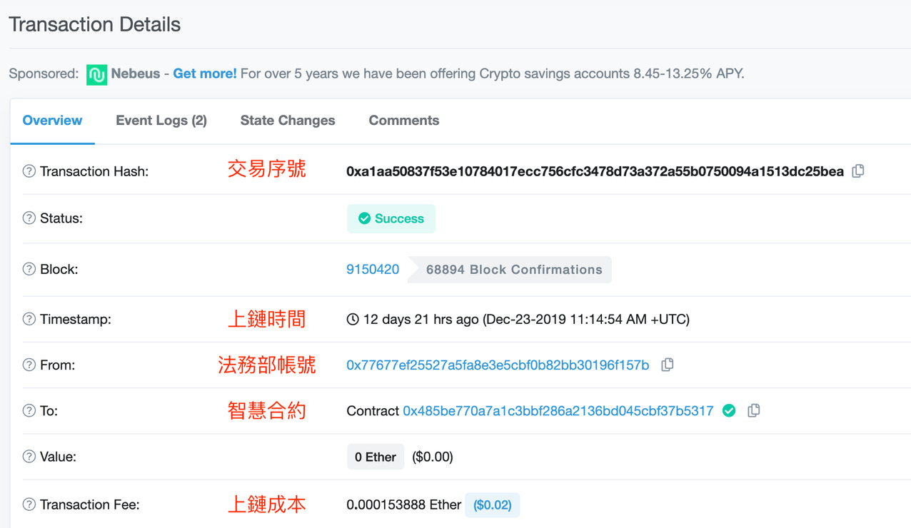 相信你已經注意到,這個畫面中出現好幾個與區塊鏈相關的資料欄位,以下我分別說明。