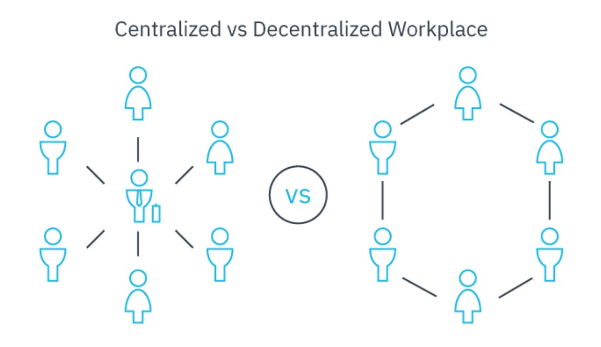 假設在一間教室裡面,老師規定所有同學若要彼此說話,一律都得先跟老師講,再由老師轉傳給另一位同學,禁止同學之間直接溝通。這就是中心化傳遞,而老師就扮演中心化機構的角色。可想而知,老師不僅可能過濾一些極端言論(例如自動忽略髒話),老師的表達能力和主觀立場也侷限了全班同學的多元討論氛圍。相對於同學之間可以直接聊天,不需要凡事經過老師的去中心化協作,中心化會大幅限制生態的蓬勃發展。