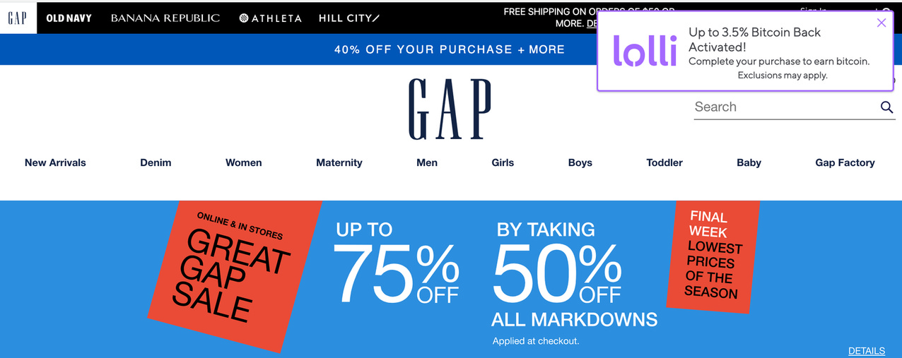 假設在 GAP 買衣服,透過 Shopback 轉介可以獲得 3% 的現金回饋,而透過 Lolli 則可以獲得 3% 的比特幣回饋,你會選擇哪一種呢?我相信有不少人會選比特幣。