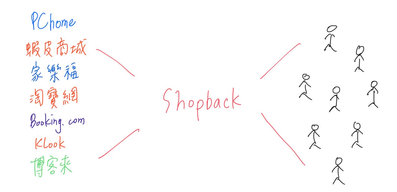 消費者只要透過 ShopBack 網站前往其他購物平台消費,便有一部分的消費會轉為現金回饋。透過獎勵機制,這樣的商業模式不但使消費者更有誘因購物,電商平台藉此也能更好地追蹤消費者來源,降低盲目投放的行銷費用。作為中間者,ShopBack 則從每一筆成交的交易中收取不同比例佣金,如此形成三方皆受益的商業模式。