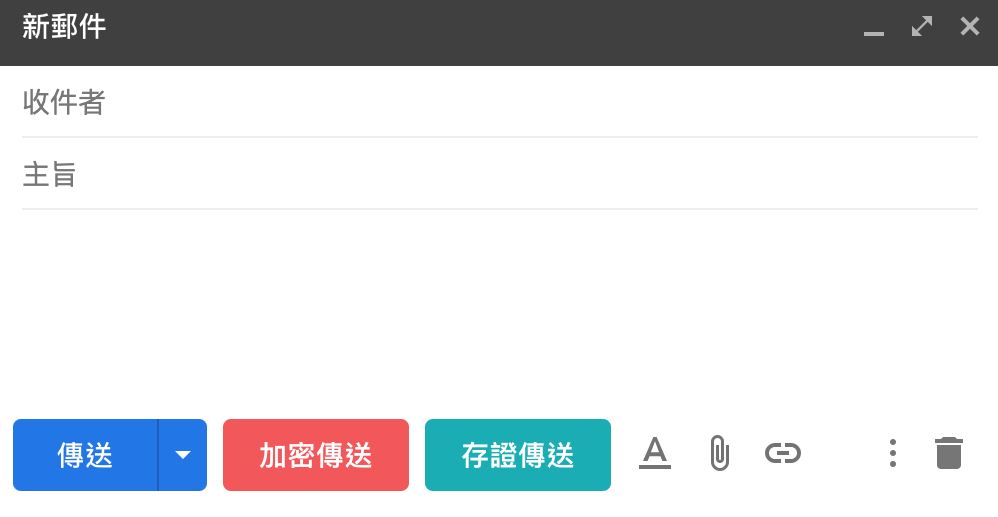 文字讀起來有點難懂,但看到操作畫面就簡單多了。安裝完外掛元件之後,打開 Gmail 寫信時就會多出下方「加密傳送」、「存證傳送」兩個按鈕。