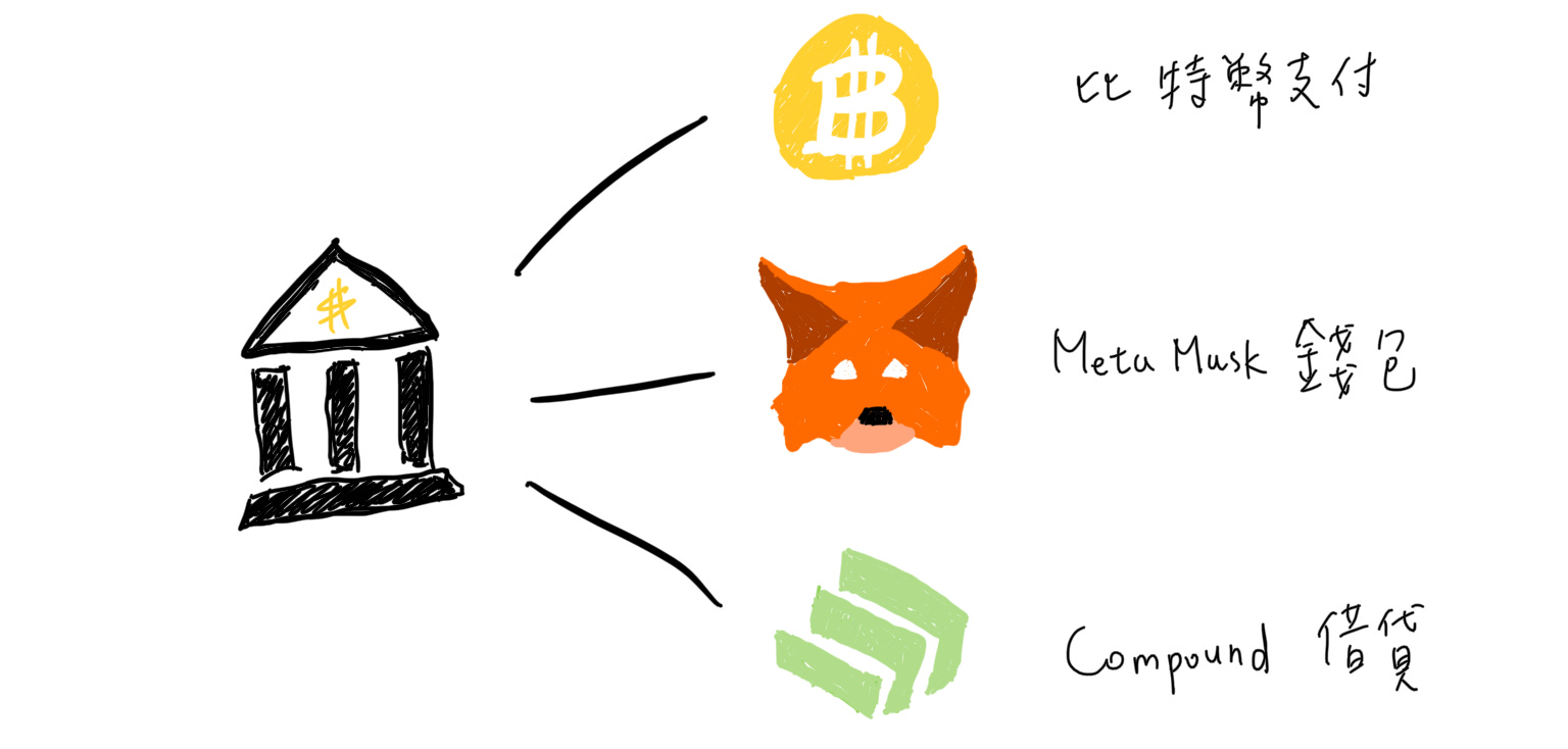 區塊鏈已經將銀行原本提供的轉帳、儲蓄及借貸服務,分別拆分成區塊鏈支付、錢包及借貸,我將他們統稱為去中心化金融(Decentralized Finance,DeFi)服務。