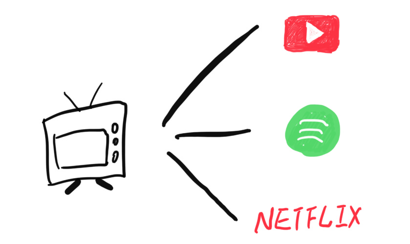 在網路尚未普及的年代,新聞、音樂、電影等資訊服務可說是被「綑綁」在電視的第四台。而現在的人則可以透過訂閱 YouTube、Spotify 和 Netflix 來分別滿足這些需求,這是網際網路帶來的「拆分」。