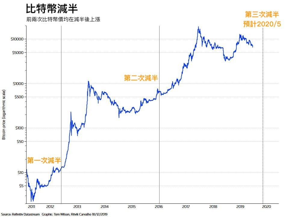 比特幣礦工以效能強大電腦(礦機)與網路上的其他電腦競爭,爭相在區塊鏈上增加新的區塊(block)。他們將獲得一定數量的比特幣,目前為 12.5 顆比特幣。以當前的區塊新增速度,下一個減半將在 5 月發生,屆時比特幣獎勵將會降至 6.25 顆比特幣。在前兩次減半(2012/11、2016/7)後的一年中,比特幣價格分別上漲了 80 倍和 4 倍左右。
