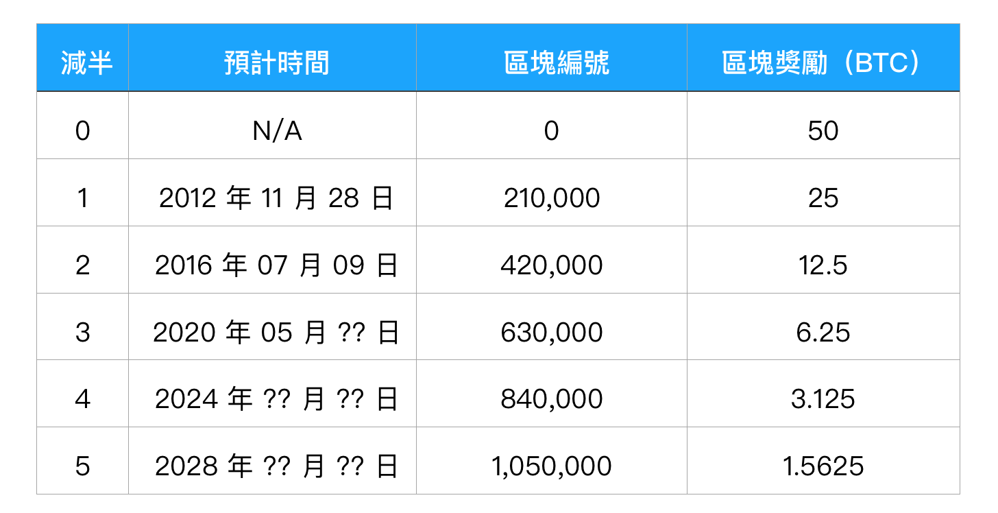 區塊鏈的事件都並非按照時間當成觸發依據,區塊編號(block height)才是區塊鏈領域的「中原標準時間」。例如比特幣第一次減半是發生在區塊編號 210,000,第二次是發生在區塊編號 420,000,第三次是 630,000,依此類推。每隔 210,000 個區塊,比特幣的「挖礦獎勵」就減半一次。對照下方的表格就能一目瞭然。