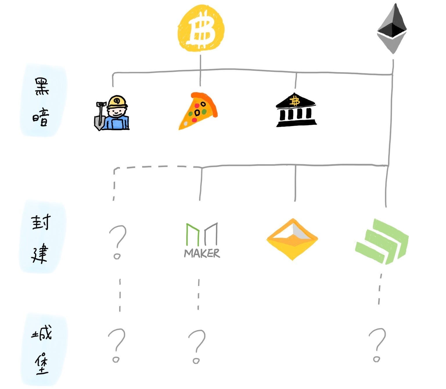 黑暗時代能夠發展的都是基礎建設與科學。進入到封建時代後,總算能夠發展更進階的科技。首先,我們看到 MakerDAO 發展出去中心化運作的穩定幣,不再需要像 USDT 仰賴 Tether 公司在幕後操縱市場流通量。有錢的地方就有借貸,Compound 隨即在 MakerDAO 的基礎上,發展出去中心化的借貸市場。就目前看來,這兩項專案可說是區塊鏈封建時代的兩大關鍵技術。
