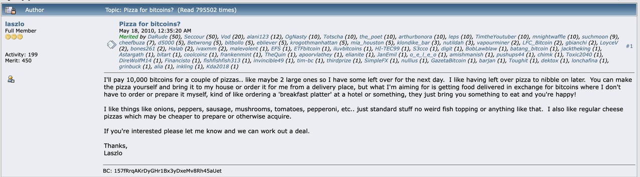 直到 2010 年 5 月 18 日,一名美國工程師漢尼克斯(Laszlo Hanyecz)在當時的比特幣論壇貼文表示,自己願意以手上的 10,000 顆比特幣交換兩盒披薩並替他送到家門口。他足足等了 4 天,直到 5 月 22 日才終於有人願意和他交易,這才「解鎖」了比特幣的交易功能。