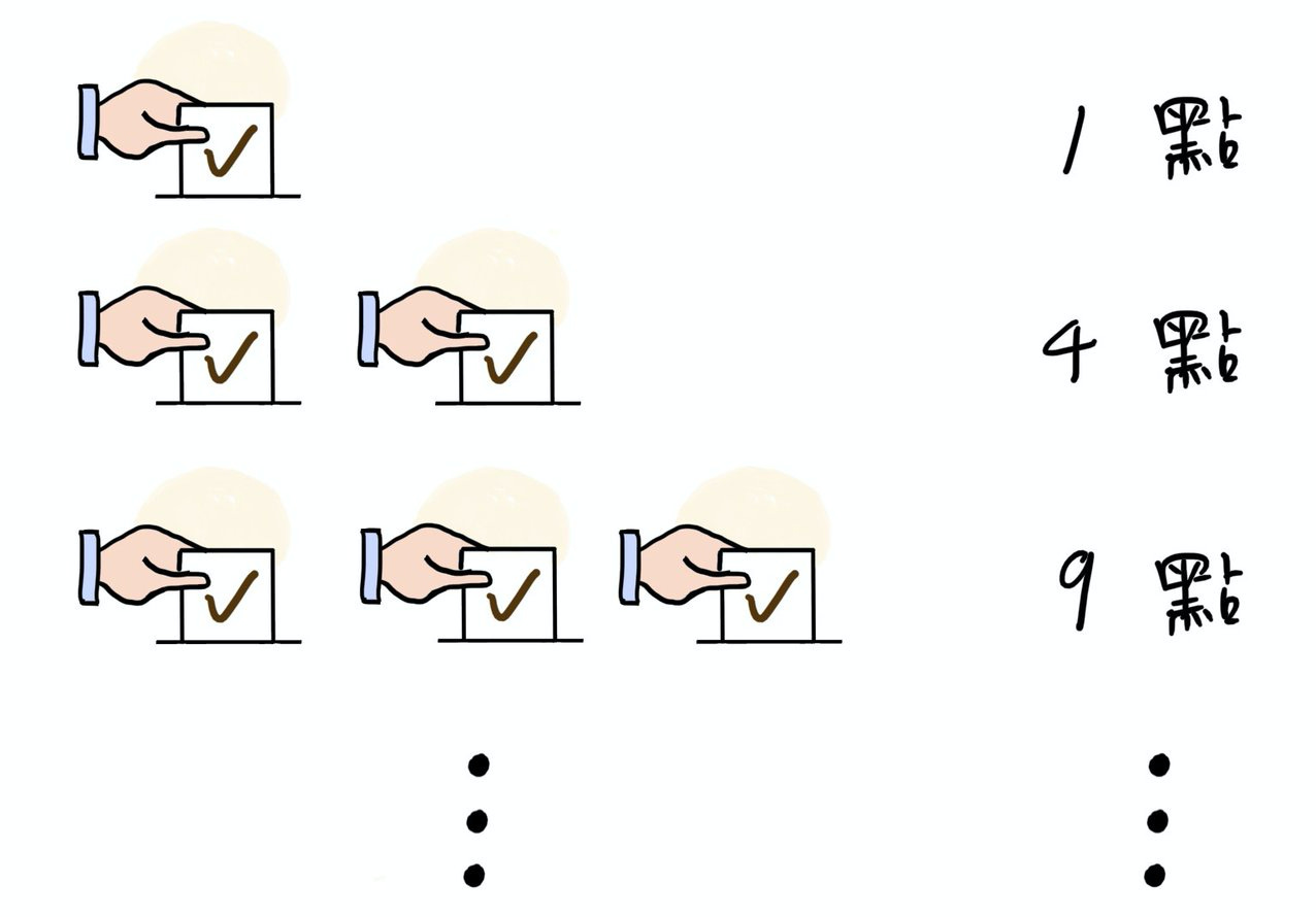 人們對單一議題最高可投 9 票,也就是 9^2 = 81 點。 因為投 10 票,就得花費 10^2 = 100 點,而每人最多只有 99 點。這也是總統盃黑客松的精心設計。讓人們覺得剩下來的點數「不投浪費」,進而試著了解更多議題。至於每項提案要投幾票,就看每個人對不同議題的重視程度了。