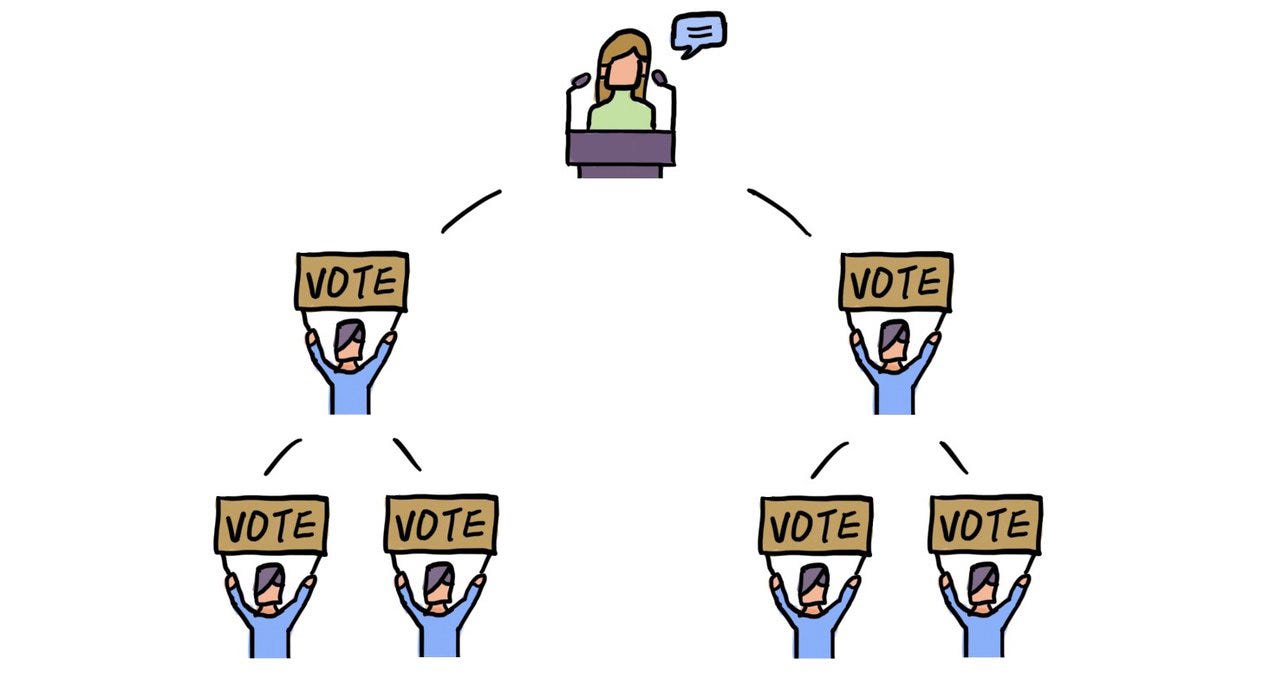 你,作為一個選舉人,可以選擇將票完全或部分(0~100%) 委任給其他選舉人。這個人,可能是你身邊政治參與度比較高的朋友,也可能是你的村長里長,也可能是你信任的意見領袖。你信任這個人,覺得他會做出更正確的決定。
