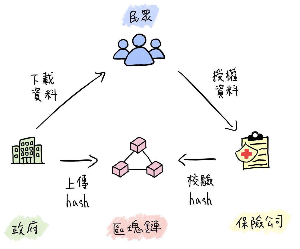 舉例來說,當保險公司向保戶索取病歷資訊時,傳統的做法是人們得向政府申請紙本證明,保險公司再檢視紙本證明上是否蓋有印章,以確認這些資料正確性。當這些健康資料都數位化之後,政府也得以數位的方式替資料作證 —— 資料上鏈。