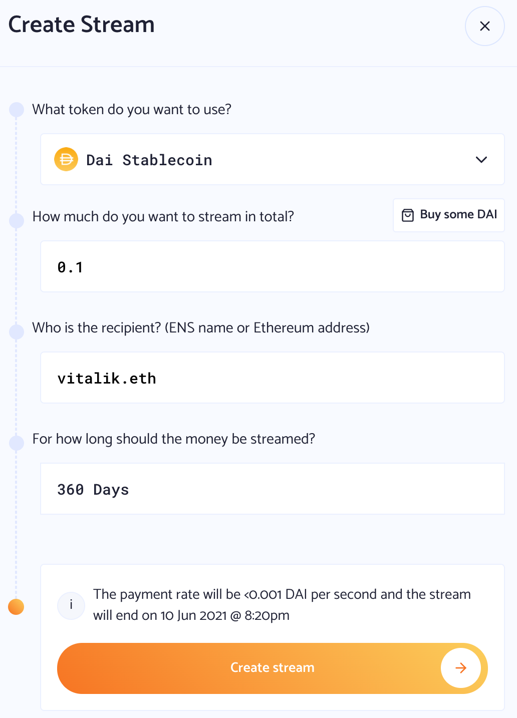 下圖中,我設定將在未來的 360 天內,分批(按秒)支付總額 0.1 顆 Dai(約 3 元台幣)給以太坊創辦人 Vitalik Buterin 的錢包 vitalik.eth。