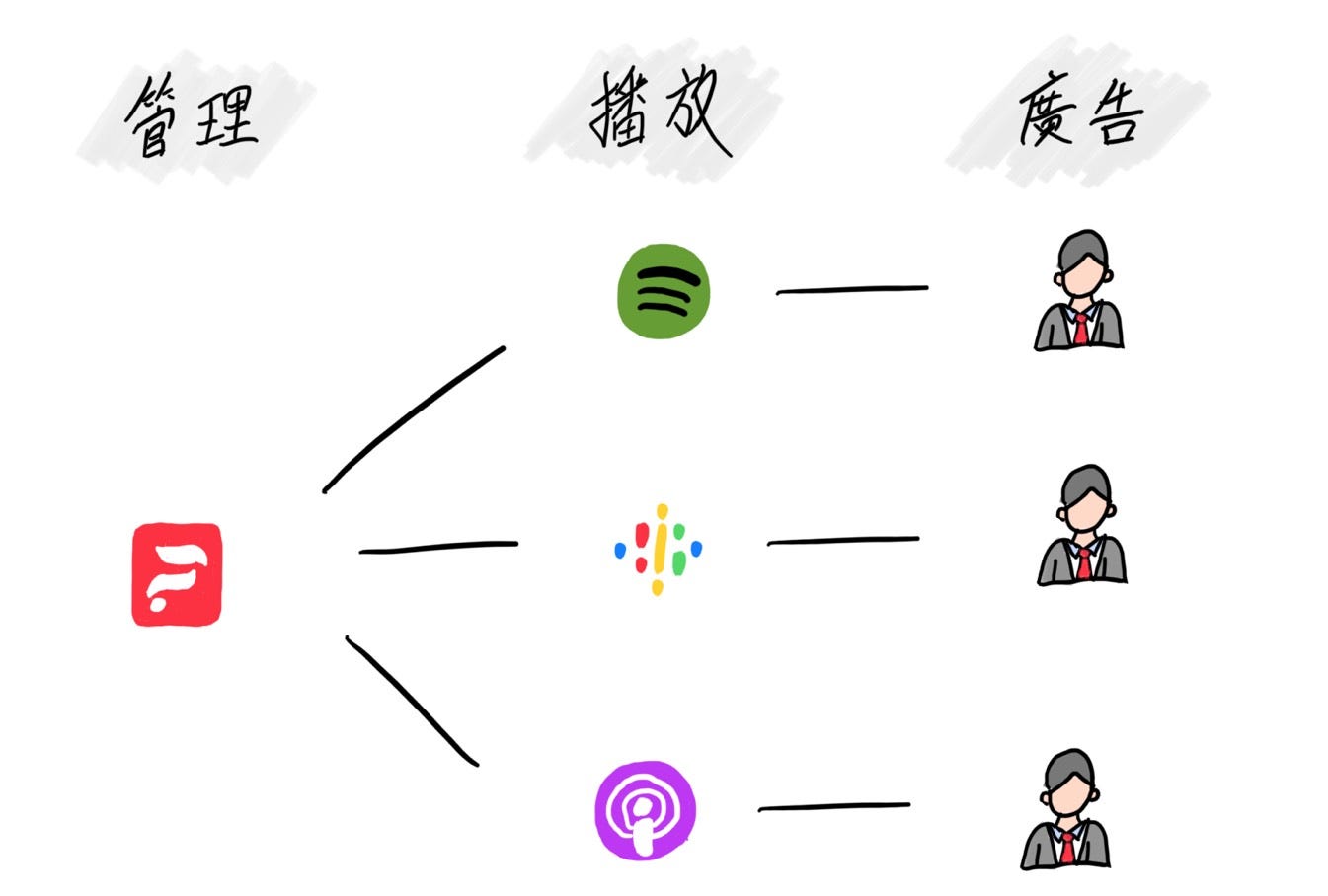 podcast 沒有統一的大平台。檔案的上傳、播放和廣告至今都還是由不同企業分工完成。人們常用來收聽節目的 Apple Podcast、Spotify 都只有播放器的功能,完全不負責檔案管理(hosting)和廣告置入。