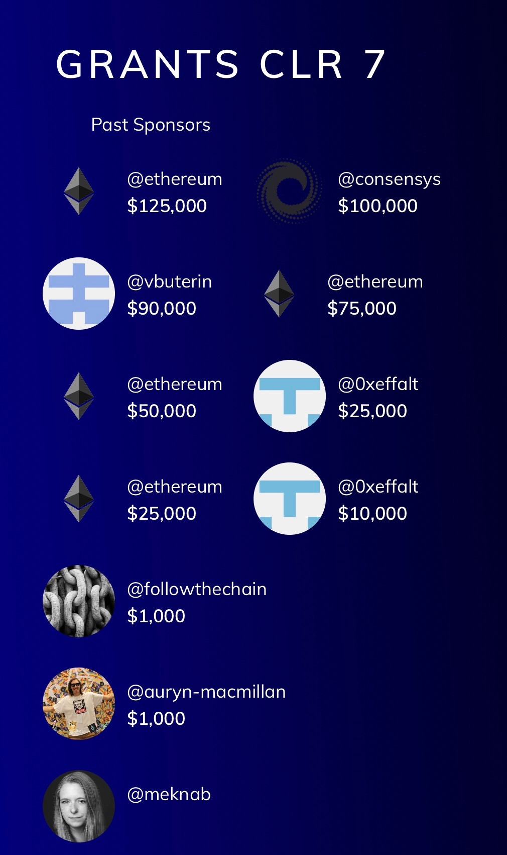 下方就是 Gitcoin 舉辦第 6 輪募資時的贊助方。當時有不少提案都與區塊鏈有關,而且 Gitcoin 又是只收加密貨幣的平台,所以吸引了以太坊基金會、Consensys 公司提供贊助資金。這就像是廣告主冠名贊助會有一定的宣傳效果,只是目前僅列出名字的做法還相當陽春、贊助金額和參與者也還不夠多就是了。