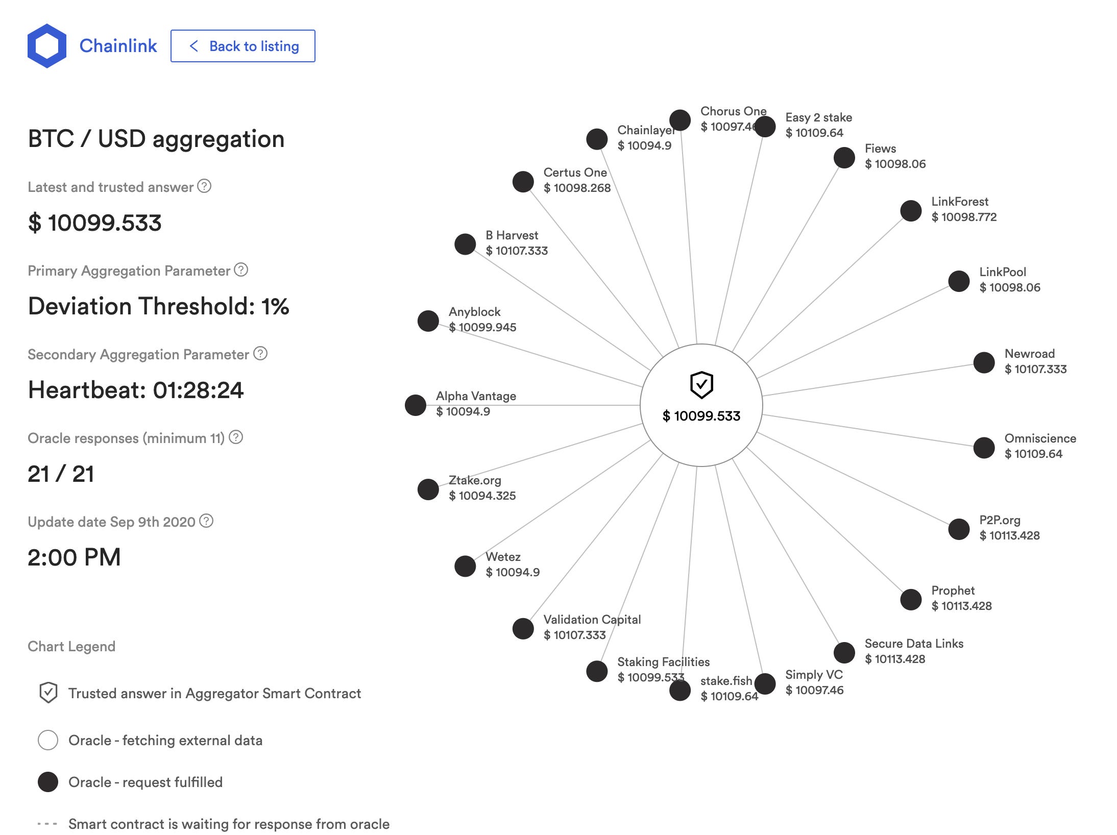 左方是基本資訊,包含交易對、當前報價、誤差範圍、下次報價倒數以及報價者人數。而右方的圓圈上,每個黑點都是一位 ChainLink 的報價者。他們負責透過 API 從外部取得資料,將數據交給 ChainLink 的智慧合約處理,並產出最新報價(中間圓圈)。