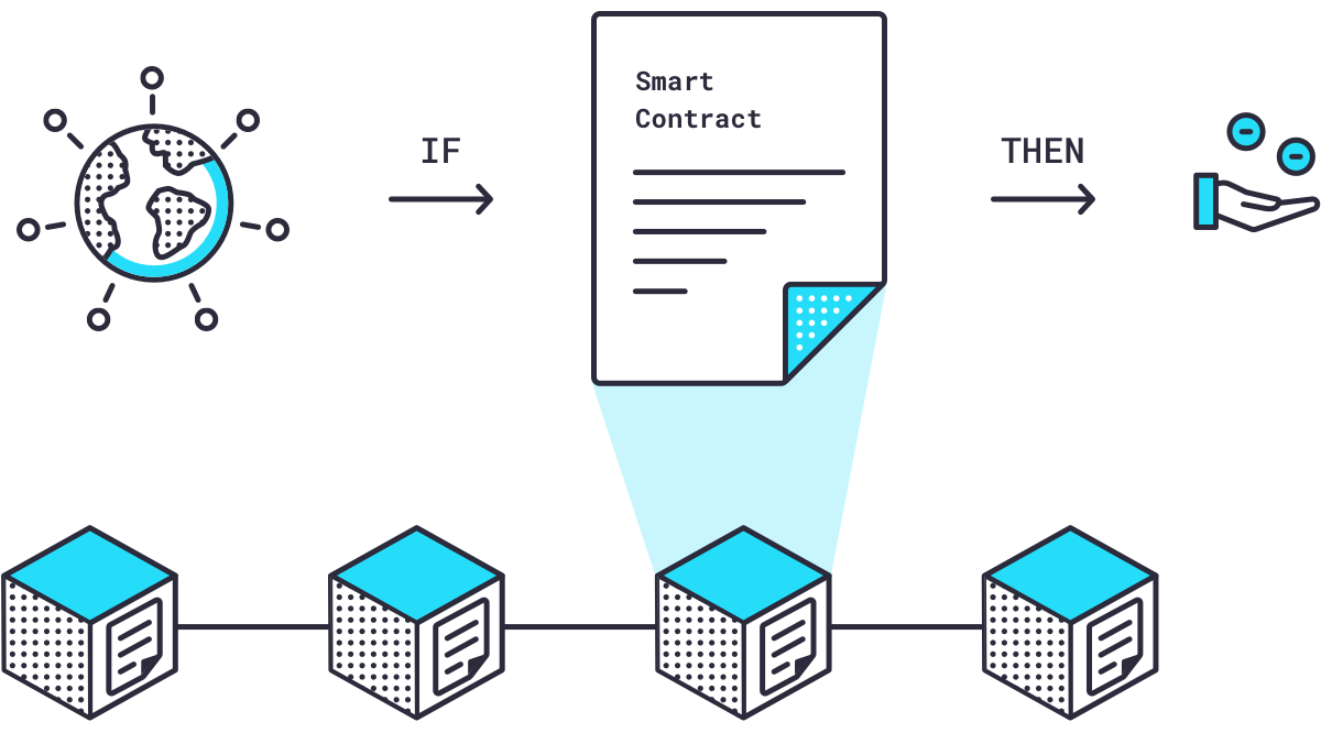 智慧合約就是一般的程式碼,它本身並不會知道外界世界發生了什麼事,得靠 API 輸入資料才能與外界資訊同步。這和前陣子相當知名的「口罩地圖」類似: