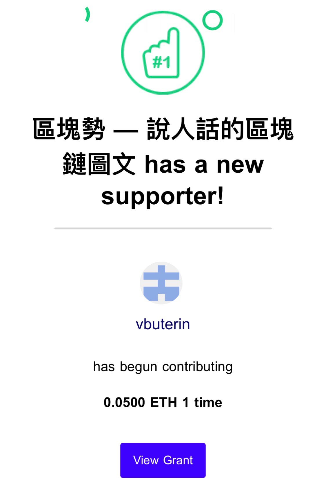 先說個我開心了一整天的消息。區塊勢在群募平台 Gitcoin 上收到以太坊創辦人 Vitalik Buterin 的 ETH 小額贊助!
