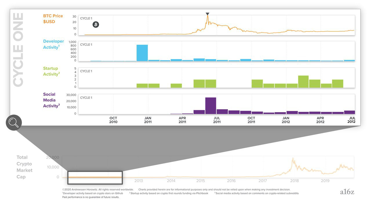 人們無法預測未來,卻可以分析歷史。如果你也相信歷史總會重演,那麼你可能會對幣價的「循環」有興趣。矽谷知名創投 a16z 就將幣圈從 2009 年到 2020 年的發展,歸納為三次的「幣價-創新」循環。