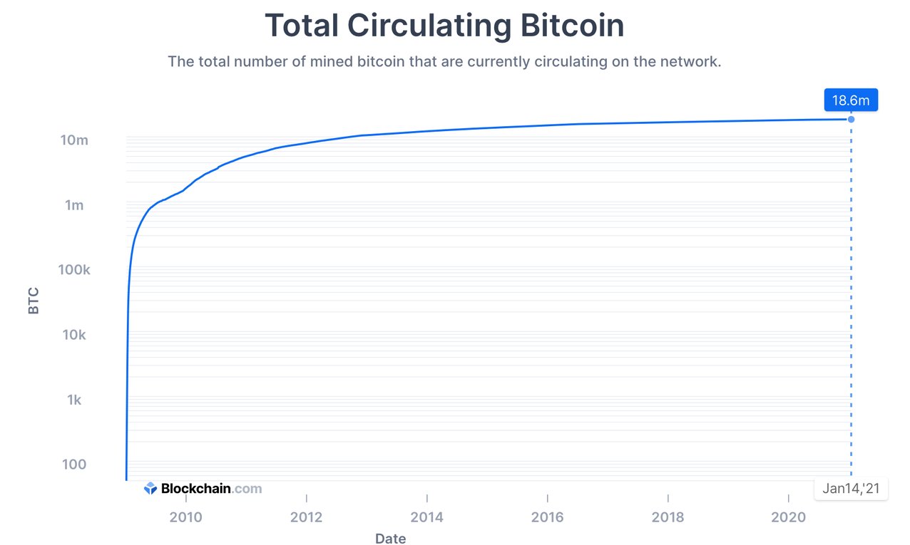比特幣的總供給量為 2,100 萬顆,且預計在西元 2140 年發行完畢。目前在市面上流通的比特幣已經達到 1,860 萬顆,佔總量的 88.6%。也就是說,絕大多數的比特幣都已經「出土」了。