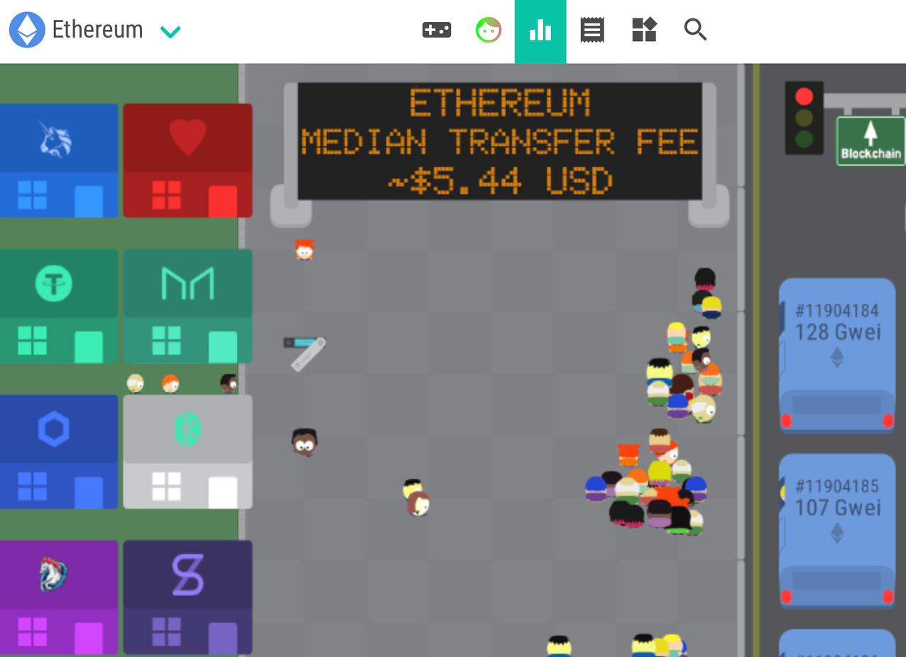 以太坊壅塞是個老問題。txstreet 網站把區塊鏈上的壅塞情況視覺化 ,如下圖。