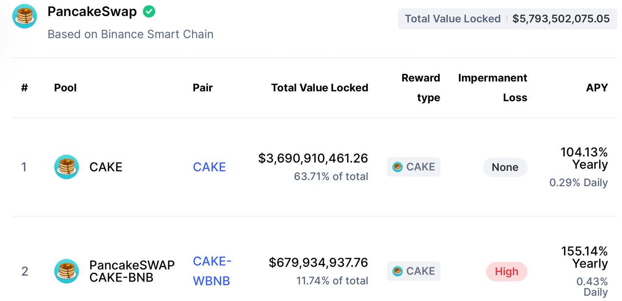 如下圖,在 PancakeSwap 內抵押 CAKE 幣就能獲得 104% 的年利率。如果你同時持有 CAKE 和 WBNB 這兩種幣的話,還可以為 PancakeSwap 提供交易流動性2,並獲得 155% 的年利率。也就是說,若利率不變,人們放在裡面的資產在一年後就會跟著翻倍。