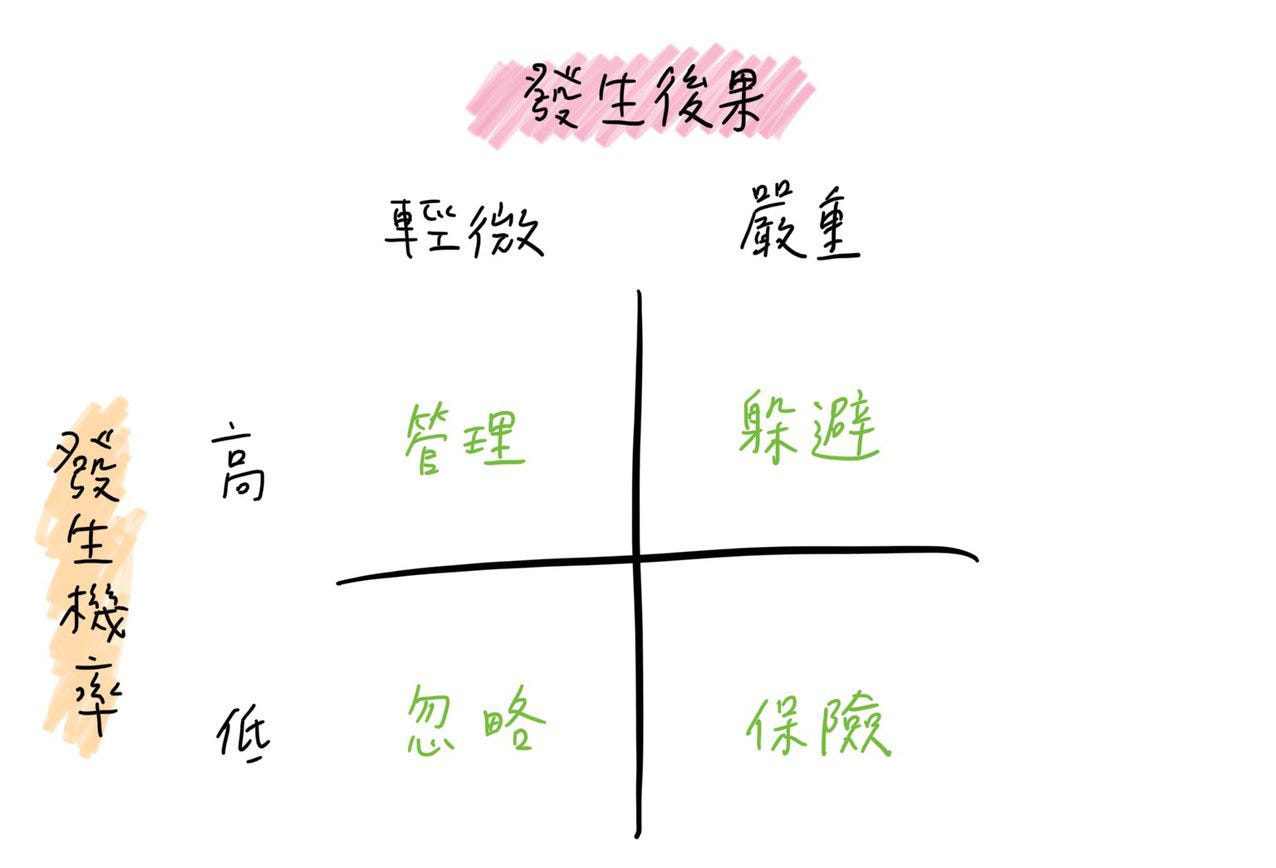 左下角:意外發生機率低,即便發生也沒有太大影響。此時可以選擇「忽略」風險。