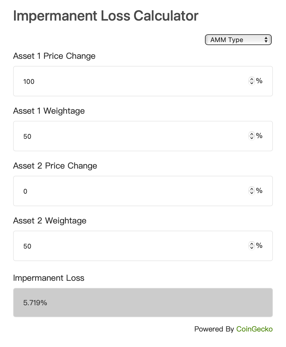 我實際計算後發現,無常「損失」沒有想像中嚴重。以下圖為例,即便有一項資產價格變動了 100%,帶來的無常損失也只有 5.7% 而已。