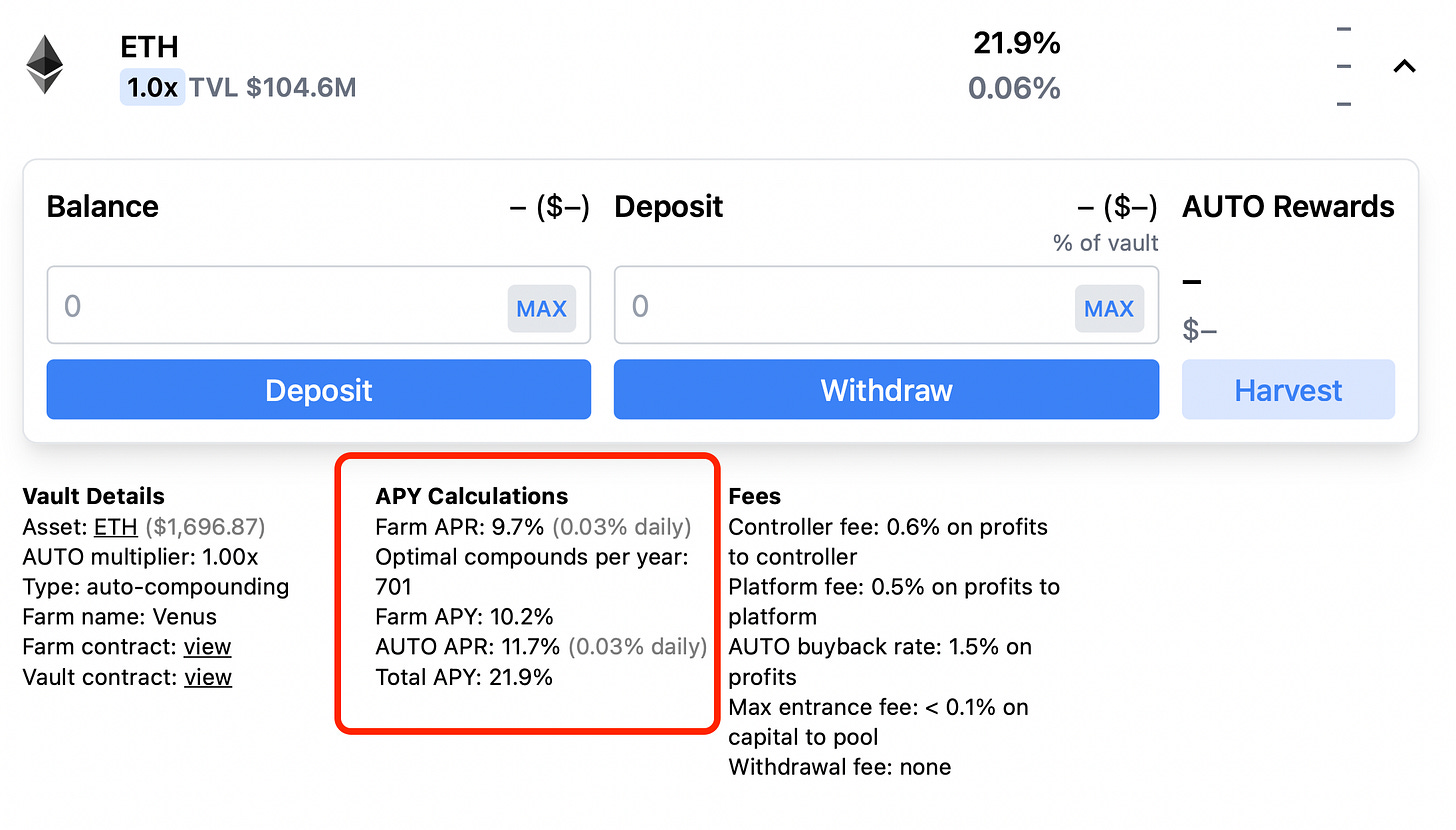 下圖的 ETH Vaults 便明確指出,21.9% 的利率中有 10.2% 是以 ETH 支付,另外的 11.7% 則會是以 AUTO 幣支付。