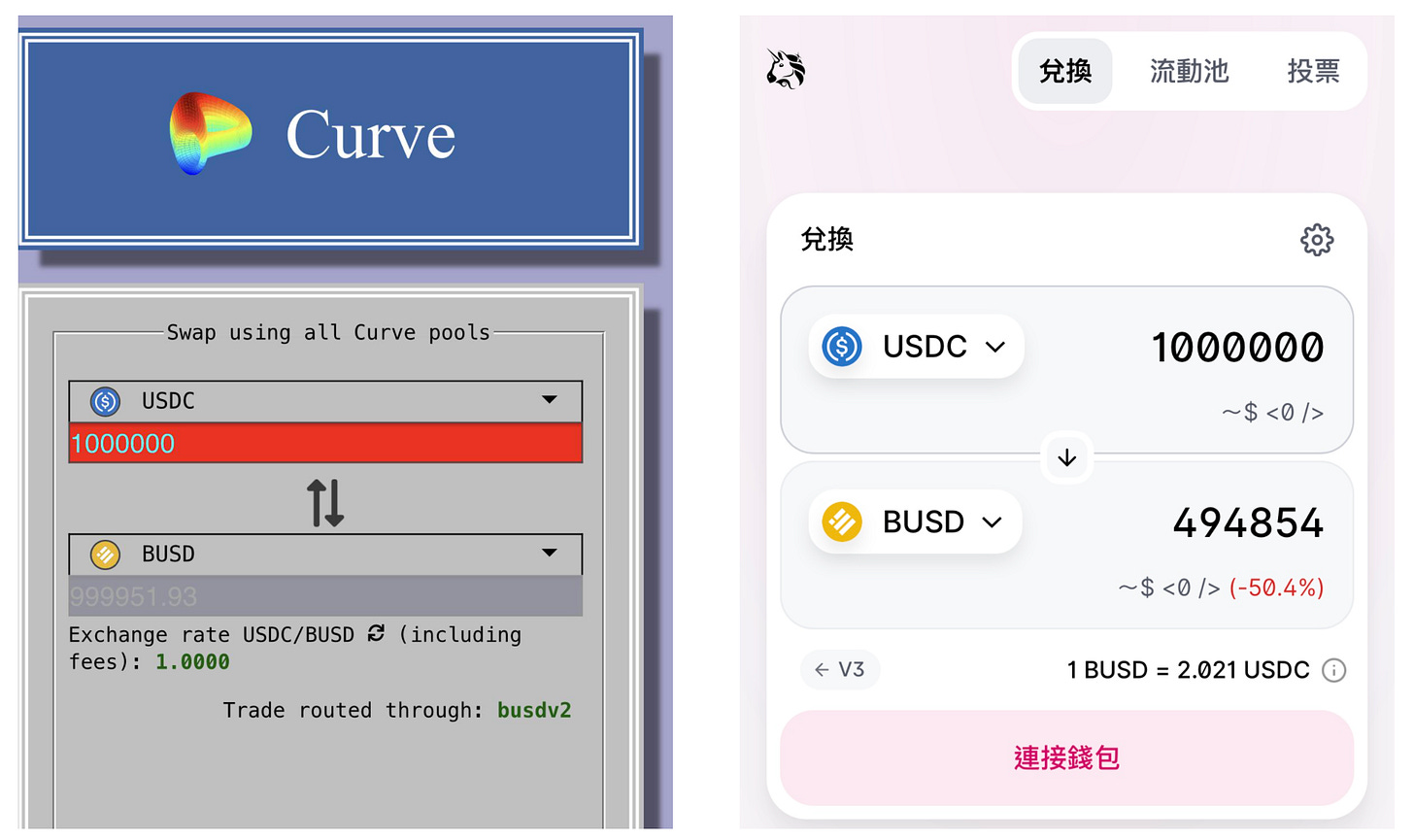USDC 和 BUSD 都是美金穩定幣,理論上兩者要能以 1:1 互換 —— 以 100 萬顆 USDC 換得 100 萬顆 BUSD。但實際上,在 Curve 可以換到 99.99 萬顆 BUSD,而在 Uniswap 卻只能換得 49.48 萬顆 BUSD。