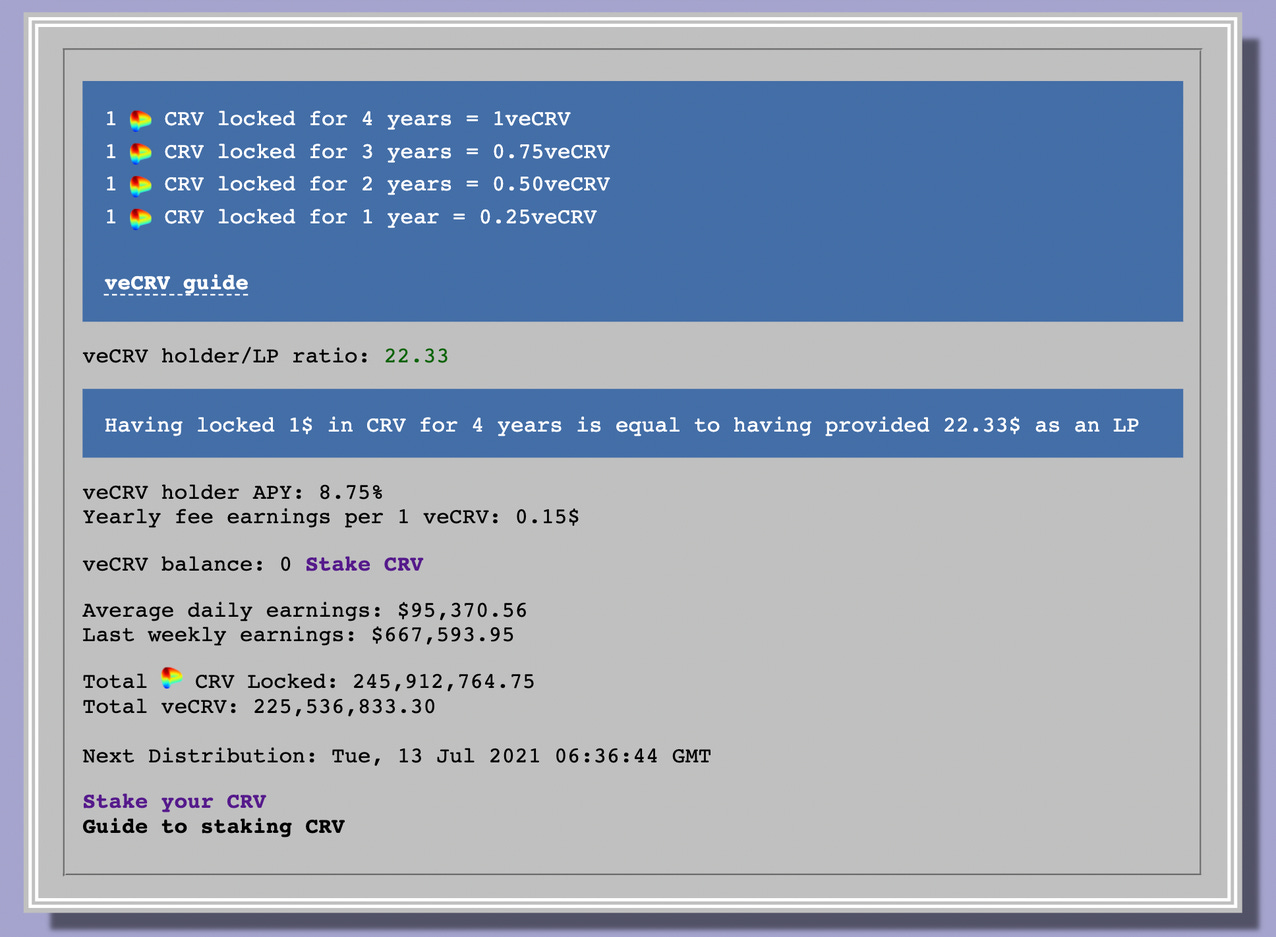 穩定幣發行商得先從市場上買入 CRV 幣,並鎖入智慧合約一段時間,才能獲得代表投票權的 veCRV(voting escrow CRV)參與治理。CRV 最長可以鎖倉 4 年。將 CRV 鎖倉越久,能獲得的投票權 veCRV 也就越多。