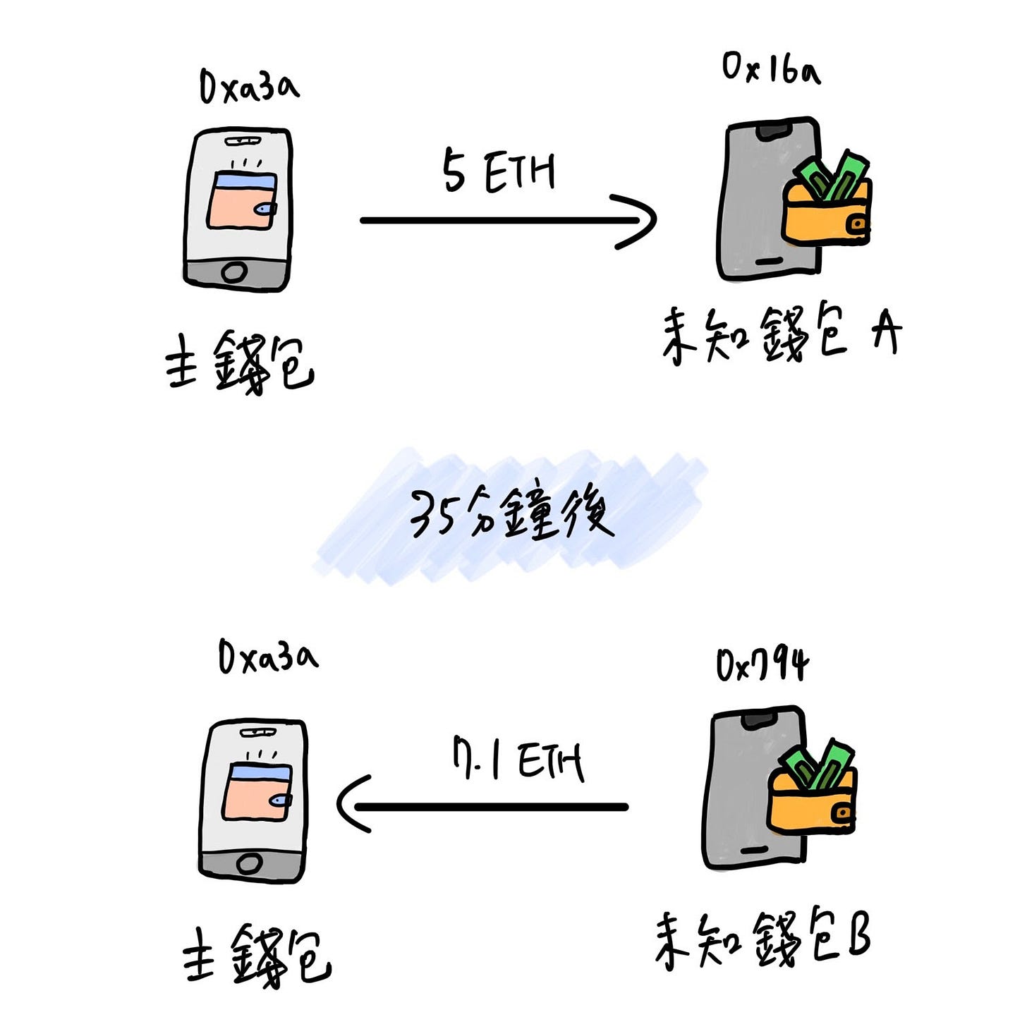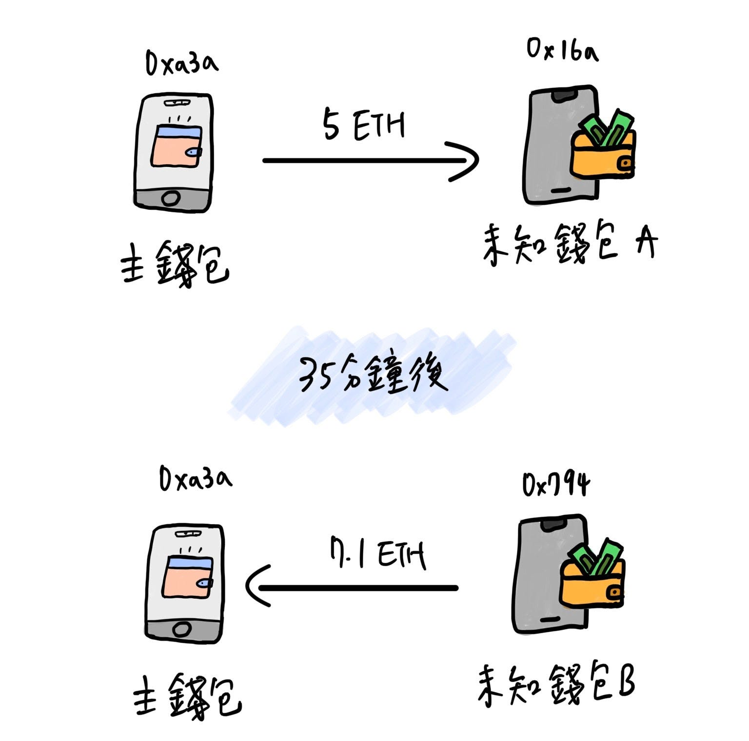 交易紀錄顯示,在 9 月 14 日 4 點 55 分,Chastain 從主錢包(0xa3a)轉出 5 顆 ETH 給一個未知錢包 A(0x16a)。35 分鐘之後,Chastain 的主錢包(0xa3a)則從另外一個未知錢包 B(0x794)收到一筆 7.1 顆 ETH 的轉入款項。