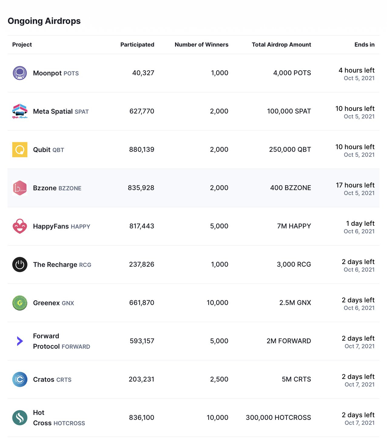 以加密貨幣資訊網站 CoinMarketCap 為例,近期他們開闢了空投專區,讓使用者一站式地領完各種加密貨幣的空投。下圖就是目前正在進行,以及未來即將推出的加密貨幣空投。網站也會即時顯示目前的空投參與人數、總空投的數量以及結束時間。