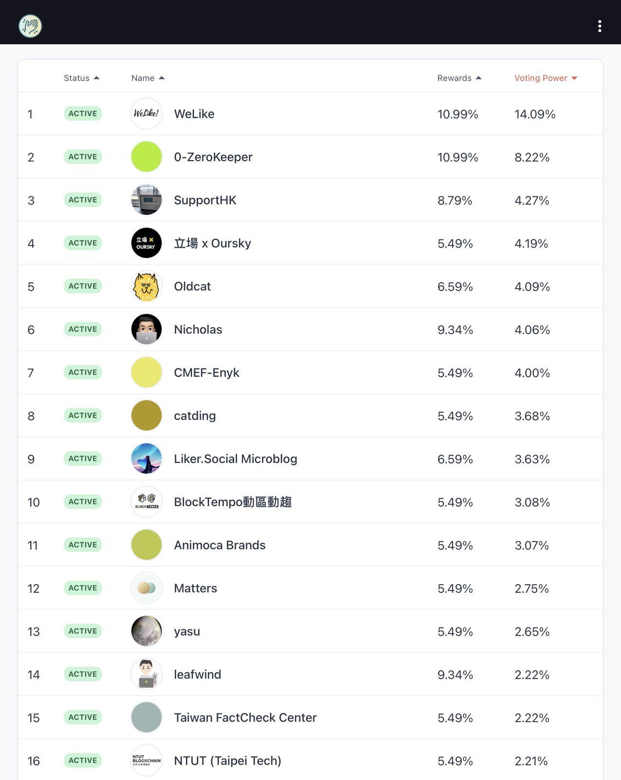 這比定期定額捐款更簡單。如果未來幣價上漲,所有人都能雨露均霑。反過來說,驗證者也得定期向委託人交代自己做了哪些事、對於社群治理的想法,才能收到更多的 LIKE 委託。
