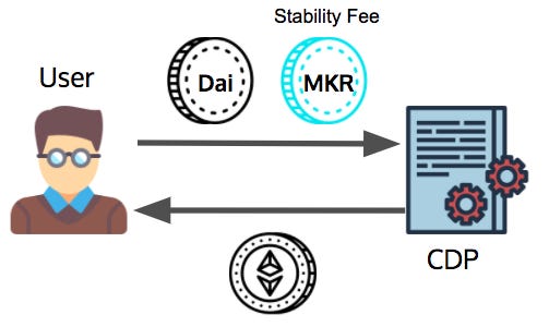 簡單來說,使用者使用完 Dai 之後,就得到交易所買 MKR 支付 Dai 的使用費,才能取回抵押在 CDP 的以太幣。