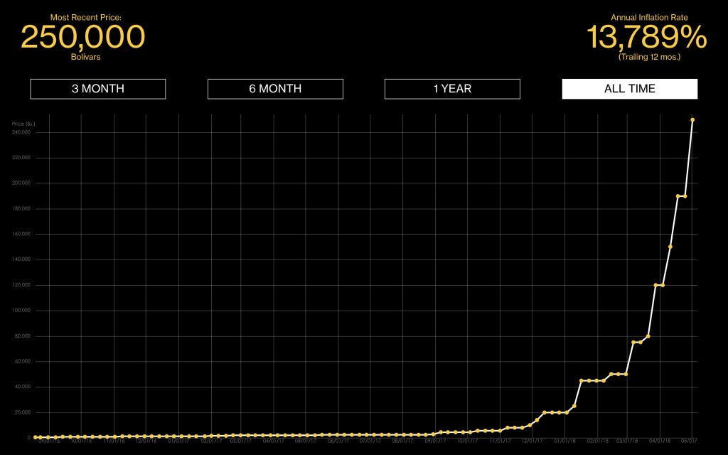 換句話說,你如果在委內瑞拉工作,過去一年老闆沒有幫你加薪 138 倍的話,你就買不起咖啡了。或者,你可以想像現在一杯 65 元的路易莎咖啡,在一年之後它會漲到一杯 9,000 元。