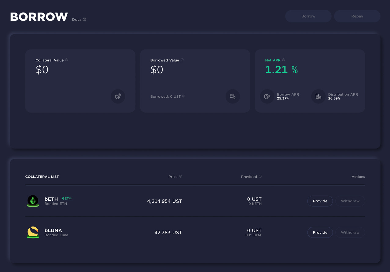 目前 Anchor 只接受兩種抵押資產,分別是 bETH 和 bLUNA。其中 bETH 代表的是抵押在 Lido 的 ETH(也就是 stETH),只是 1:1 映射到 Terra 區塊鏈上而已。不同的是持有 bETH 的用戶,可以直接以美金穩定幣(UST)領取 ETH 的挖礦獎勵。