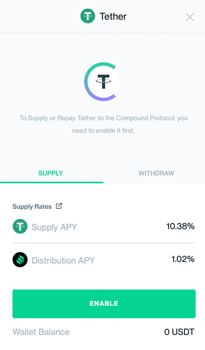 以下圖為例,截圖當下在 Compound 的 USDT 存款利率為 10.38%,而額外贈送的 COMP 幣獎勵還能讓收益再增加 1.02%。如果不計 COMP 幣本身的價格波動,存款者能夠賺取 11.4% 的年收益率。這是 DeFi 借貸最基礎的形式。