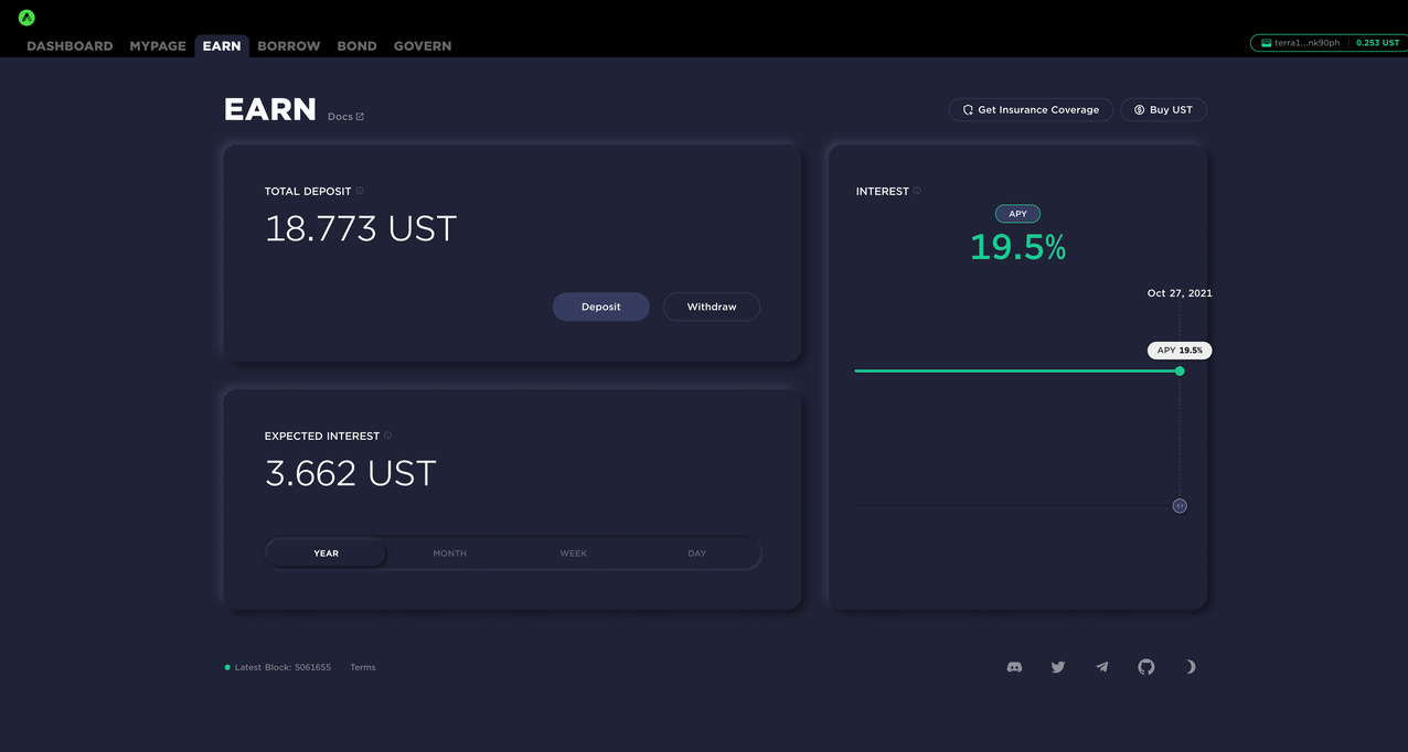 要在 Anchor 放貸非常簡單,只要存入 UST,就可以獲得代表存款收據的aUST。拿到 aUST 的同時,就已經開始賺取收益了。