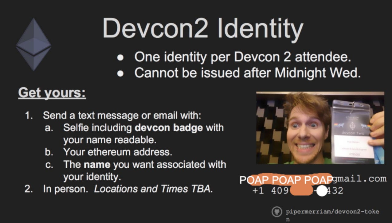 2016 年,以太坊基金會的核心開發者 Piper Merriam 嘗試在以太坊的年度盛會 Devcon 2 發行鏈上的活動參與憑證—— Devcon2 代幣。當時參與者要在現場找到 Piper Merriam 本人才能領取。或是像下圖的參與者一樣,拿著入場憑證自拍,再附上以太坊地址,將資訊 email 到他的信箱領取。